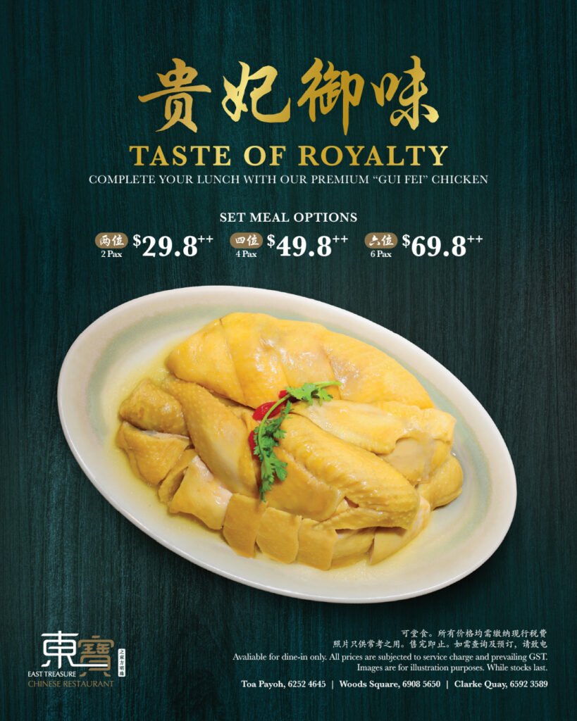 Enjoy our new “Gui Fei” Chicken set from $29.80++ (2 pax). Available daily for dine-in lunch at all outlets, excluding public holidays. while stocks last.